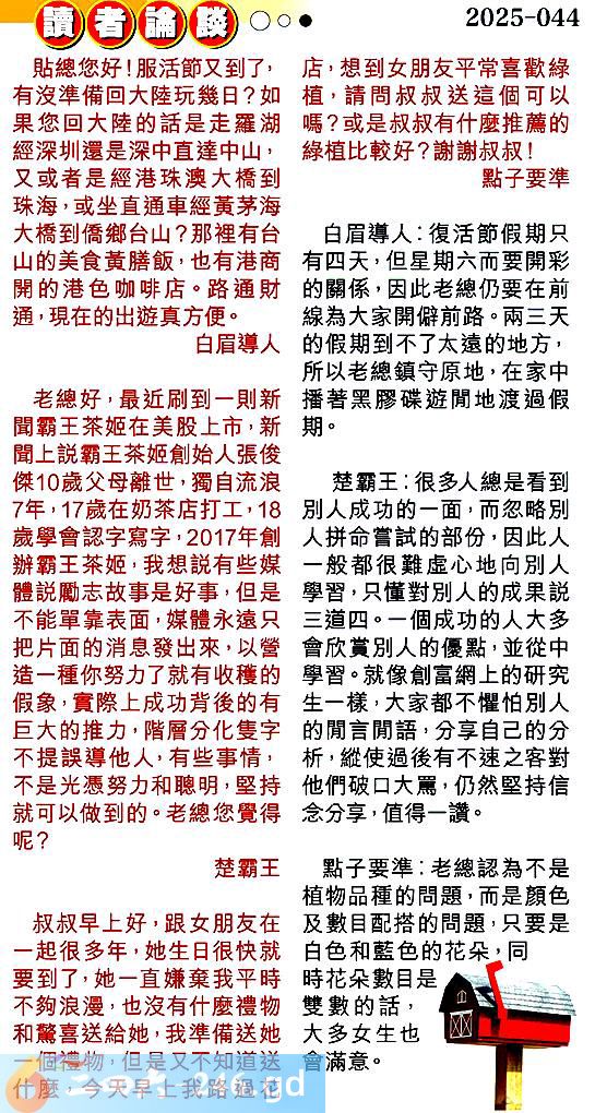 第零四四期讀者論談 1.貼總您好!服活節又到了,有沒準備回大陸玩幾日?如果您回大陸的話是走羅湖經深圳還是深中直達中山,又或者是經港珠澳大橋到珠海,或坐直通車經黃茅海大橋到僑鄉台山?那裡有台山的美食黄膳飯,也有港商開的港色咖啡店。路通財通,現在的出遊真方便。白眉導人 〖白眉導人〗:復活節假期只有四天,但星期六而要開彩的關係,因此老總仍要在前線為大家開僻前路。兩三天的假期到不了太遠的地方,所以老總鎮守原地,在家中播蓍黑膠碟遊閒地渡過假期。 2.只老總好,最近刷到一則新聞霸王茶姬在美股上市,新聞上說霸王茶姬創始人張俊傑10歲父母離世,獨自流浪7年,17歲在奶茶店打工,18歲學會認字寫字,2017年創辦霸王茶姬,我想說有些媒體說勵志故事是好事,但是不能單靠表面,媒體永遠只把片面的消息發出來,以營造一種你努力了就有收穫的假象,實際上成功背後的有巨大的推力,階層分化隻字不提誤導他人,有些事情,不是光憑努力和聰明,堅持就可以做到的。老總您覺得呢?楚霸王 〖楚霸王〗:很多人總是看到別人成功的一面,而忽略別人拼命嘗試的部份,因此人一般都很難虚心地向別人學習,只懂對別人的成果說三道四。一個成功的人大多會欣賞別人的優點,並從中學習。就像創富網上的研究生一樣,大家都不懼怕別人的閒言閒語,分享自己的分析,縱使過後有不速之客對他們破口大罵,仍然堅持信念分享,值得一讀。 3.叔叔早上好,跟女朋友在一起很多年,她生日很快就要到了,她一直嫌棄我平時不夠浪漫,也沒有什麼禮物和驚喜送給她,我準備送她一個禮物,但是又不知道送什麼,今天早上我路過花店,想到女朋友平常喜歡綠植,請問叔叔送這個可以嗎?或是叔叔有什麼推薦的綠植比較好?謝謝叔叔!點子要準 〖點子要準〗:老總認為不是植物品種的問題,而是顏色及數目配搭的問題,只要是白色和藍色的花朵,同時花朵數目是雙數的話,大多女生也网會滿意。