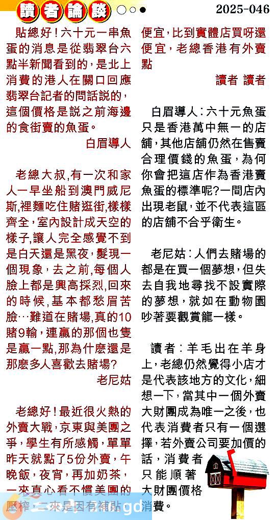 第零四六期讀者論談 1.貼總好!六十元一串魚蛋的消息是從翡翠台六點半新聞看到的,是北上消費的港人在關口回應翡翠台記者的問話說的,這個價格是說之前海邊的食街賣的魚蛋。白眉導人 〖白眉導人〗:六十元魚蛋只是香港萬中無一的店鋪,其他店铺仍然在售賣合理價錢的魚蛋,為何你會把這店作為香港賣魚蛋的標準呢?一間店內出現老鼠,並不代表這區的店铺不合乎衛生。 2.老總大叔,有一次和家人一早坐船到澳門威尼斯,裡麺吃住賭逛街,樣樣齊全,室內設計成天空的樣子,讓人完全感覺不到是白天還是黑夜,髪現一個現象,去之前,每個人臉上都是興高採烈,回來的時候,基本都愁眉苦臉...難道在賭場,真的10賭9輸,連赢的那個也隻是赢一點,那為什麼還是那麼多人喜歡去賭場?老尼姑 〖老尼姑:〗:人們去賭場的都是在買一個夢想,但失去自我地尋找不設實際的夢想,就如在動物園吵著要觀賞龍一樣。 3.老總好!最近很火熱的外賣大戰,京東與美團之爭,學生有所感觸,單單昨天就點了5份外賣,午晚飯,夜宵,再加奶茶,一來真心看不慣美團的壓榨,二來是因有補貼,便宜,比到實體店買呀還便宜,老總香港有外賣點讀者讀者 〖讀者〗:羊毛出在羊身上,老總仍然覺得小店才是代表該地方的文化,細想一下,當其中一個外賣大財團成為唯一之後,也代表消費者只有一個選擇,若外賣公司要加價的話,消費者只能順著大財團價格消費。