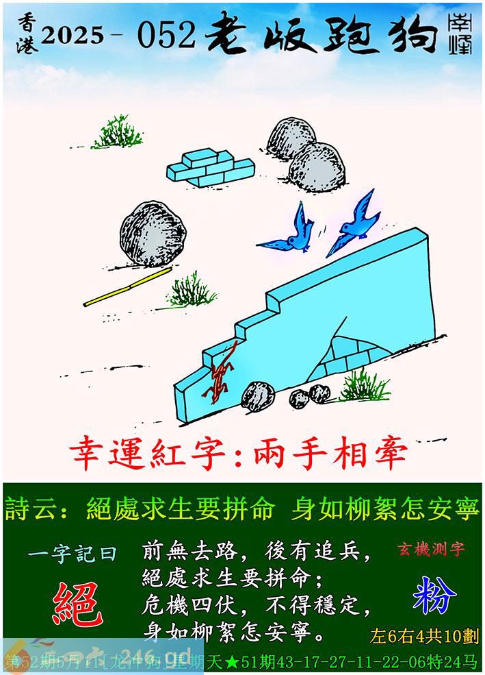 052期老版跑狗一字記之曰:【絕】 詩雲:絕處求生要拼命,身如柳絮怎安寧。 前無去路,後有追兵,絕處求生要拼命; 危機四伏,不得穩定,身如柳絮怎安寧。 玄機測字:《粉》
