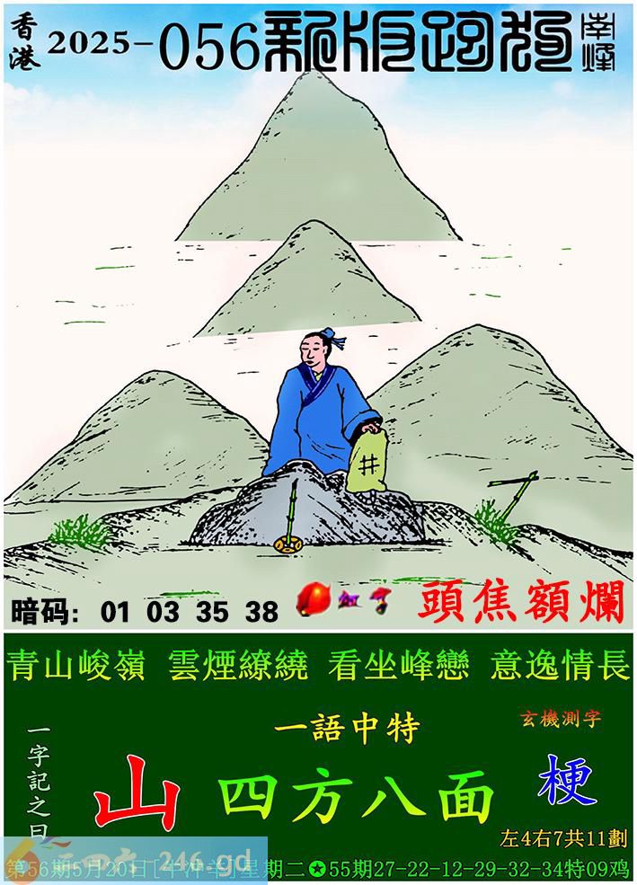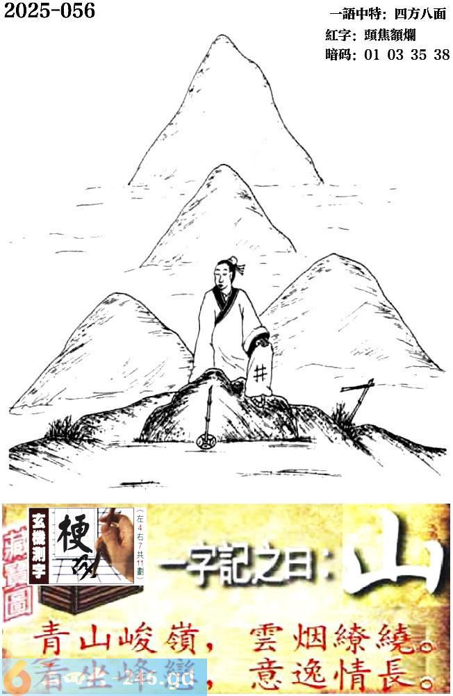 056期跑狗一字記之曰:【山】 青山峻嶺,雲煙繚繞。 看坐峰戀,意逸情長。 玄機測字:《梗》 一語中特:四方八面