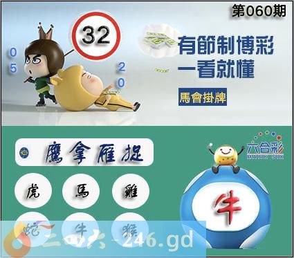 060期开奖时间2025年06月01(星期日)晚9:30开(农历五月初六牛冲羊) 生肖属性:辛丑日;五行属性:土;地支六冲:牛冲羊,无虎;六合:鼠;三合:蛇鸡。空亡肖:猪马。 六合不出:鸡鼠马;三合不出:兔狗猴;应开生肖:鸡兔猴马猪。防:虎蛇。 开奖日必开生肖牛日:蛇羊鸡鼠牛狗 开奖日日柱对应五行辛丑日:水金木 开奖日必开生肖辛丑:马猴龙鼠鸡羊 上期鸡,本期必开:虎鼠马牛猪龙狗 《060期》《《香港掛牌之全篇》》 060期正版彩图挂:32爆:牛挂牌成语:鹰拿雁捉挂牌出肖:虎马鸡蛇牛猴 [释义]比喻缉捕时的快速凶猛。 060期另版香港马会挂牌:30兔 060期马会挂牌17射2845 060期正版数码挂牌:26射:3607壹句真言:茫茫霭霭失西东(13468) 060期蓝天玄挂牌:34猪 060期四柱《申金生水人海川》 060期藏寶圖新:曷日鲜晴后土乾老:使我衣袖叁年香禁:虎禁:3尾玄機字:《东》 060期跑狗:【鋤】鋤影橫斜,沃野為家。耕翻田土,育稻栽麻。玄機測字:《判》 060期香港关门联:八一独旺容易猜,兔鼠马蛇是特码。解[容][8512] 060期香港开门联:青楼女子又放荡,本期要钱看绿蓝。解[青][4376] 060期另香港关门联:鸡前马后来一数,猴儿三心到娘家解[来][37268] 060期另香港开门联:马后来到三七跟,狗胆第一闻天下解[第][26179] 060期内部万花来料:万花开在三七相合四走悄,绿红色彩尽显兔藏羊居 060期台湾玄门挂牌:[来四五伴][132] 060期挂历诗:三数合双加三定,得五中三二后来。 060期火车头:烧伤马。诗:蛇死狗伤,回首定一八四。 060期火烧图解:火烧“马”。诗:今期财神送来二,三四对对出玄机。 060期无字天书:两场对立四站左,五六相合今双来。猪09 060期最老版无字天书:鸡羊牛马来一个,从中取一发大财。鼠27 060期九宫禁肖:鼠 060期必中人物:公孙瓒 060期二字经:等辈 060期六合信箱紅字:猛然突襲暗码:01151821 060期一語中特:一言九鼎 060期挂牌绝杀料/挂牌绝杀:羊 060期正版黄大仙射箭图:06射2219 060期另版黄大仙射箭图:25射3144 060期香港牌:[醉生梦死][246] 060期内部运程曰:九字独取。配密码:{248} 060期香港信封挂牌:各一姿状分(卯时上下)加1659 060期波段预测:主:15----2028--49 060期特码大小单双句:申金生水人海川解?? 060期特码大小单双句:青山绿水寻佳音解?? 060期铁算盘:倒骑毛驴是一仙(风吹草动腾天空)开:? 060期香港版《香港六合天书挂牌》天书:三五必来八必盼,好求四七来得真。天码:01、12、20、46、23、28、34 060期(香港版)六合对联诗:十二点半上联:二条龙船得锦标下联:三峡一成出来湖解:聚。密码:38726 060期正版马会大门口挂牌一句话:本期一三未过三山迎【挂39送24】开 060期另类马会大门口挂牌一句话:龙马蛇狗又离群【马会送18】开 060期香港生活开门联:天马行空横出世,鸡声啼晓千山秀。解[鹦][08762] 060期香港生活关门联:保护唐僧取西经,清早五更喔喔叫。解[上][37382]