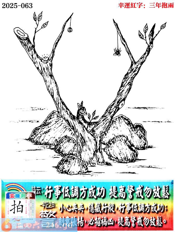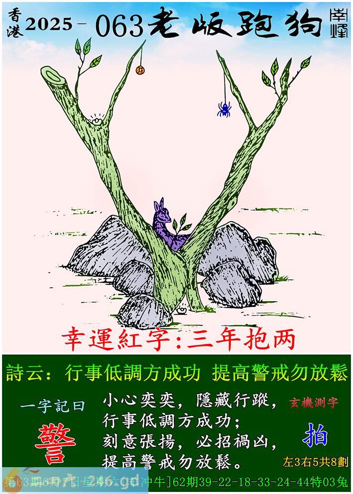 063期老版跑狗一字記之曰:【警】 詩雲:行事低調方成功,提高警戒勿放鬆。