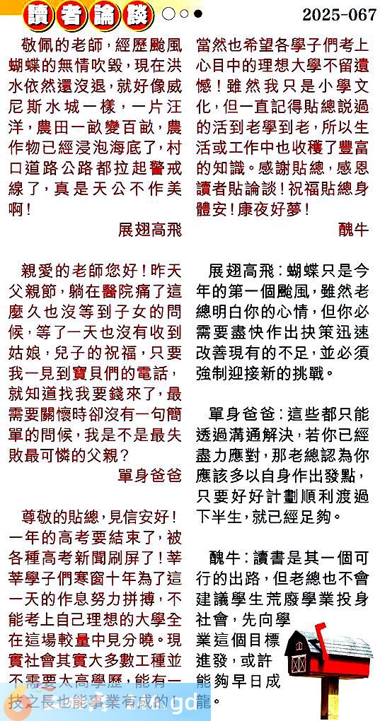 第零六七期讀者論談 1.敬佩的老師,經歷颱風蝴蝶的無情吹毁,現在洪水依然還沒退,就好像威尼斯水城一樣,一片汪洋,農田一畝變百畝,農作物已經浸泡海底了,村口道路公路都拉起警戒線了,真是天公不作美啊!展翅高飛 〖展翅高飛〗:蝴蝶只是今年的第一個颱風,雖然老總明白你的心情,但你必需要盡快作出抉策迅速改善現有的不足,並必須強制迎接新的挑戰。 2.親愛的老師您好!昨天父親節,躺在醫院痛了這麼久也沒等到子女的問候,等了一天也沒有收到姑娘,兒子的祝福,只要我一見到寶貝們的電話,就知道找我要錢來了,最需要關懷時卻沒有一句簡單的問候,我是不是最失敗最可憐的父親?單身爸爸 〖單身爸爸〗:這些都只能透過溝通解決,若你已經盡力應對,那老總認為你應該多以自身作出發點,只要好好計劃順利渡過下半生,就已經足夠。 3.尊敬的貼總,見信安好!一年的高考要結束了,被各種高考新聞刷屏了!莘莘學子們寒窗十年為了這一天的作息努力拼搏,不能考上自己理想的大學全在這場較量中見分曉。現實社會其實大多數工種並不需要太高學歷,能有一技之長也能事業有成的!當然也希望各學子們考上心目中的理想大學不留遺憾!雖然我只是小學文化,但一直記得貼總說過的活到老學到老,所以生活或工作中也收穫了豐富的知識。感謝貼總,感恩讀者貼論談!祝福貼總身體安!康夜好夢!醜牛 〖醜牛〗:讀書是其一個可行的出路,但老總也不會建議學生荒廢學業投身社會,先向學業這個目標金進發,或許能夠早日成龍。
