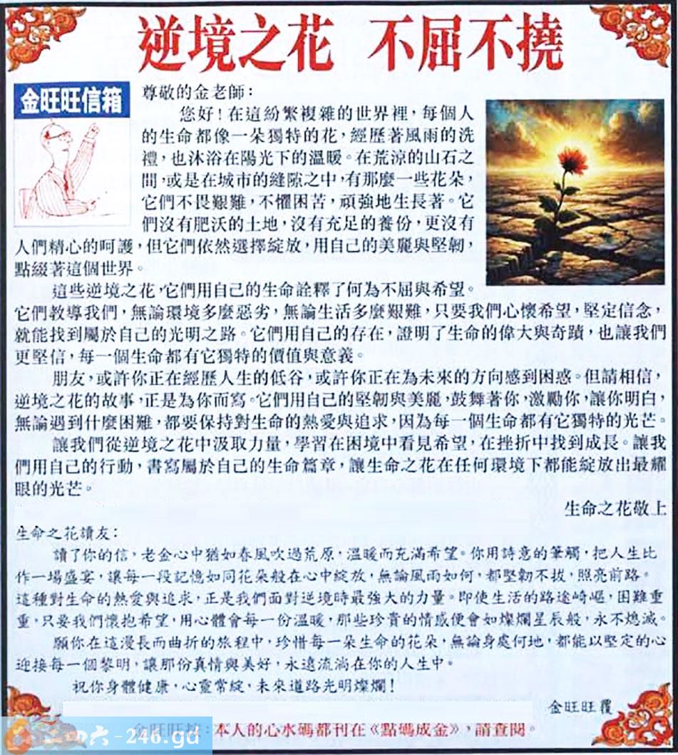 070期:金旺旺信箱彩民推荐→→《逆境之花 不屈不撓》