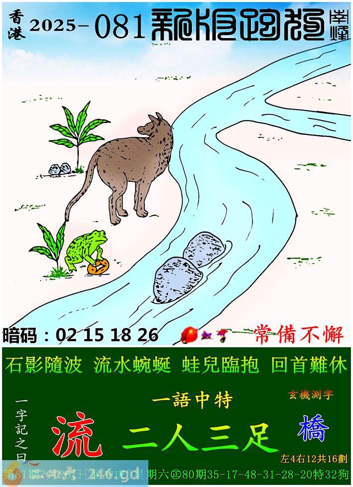 081期跑狗一字記之曰:【流】 石影隨波,流水蜿蜒。 蛙兒臨抱,回首難休。 玄機測字:《橋》 一語中特:二人三足