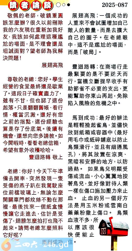 第零八七期讀者論談 1.敬佩的老師,破鏡重圓該怎麼辦?很久以前刪除我的六友現在重新加我好友,我該如何處理這種尷尬的場面,是不理會還是坦誠面對?望老師為我解決問題!展翅高飛 〖展翅高飛〗:一個成功的人重來不會試圖增加自己敵人的數量,而是去擴大自己的圈子。在老總眼中,這不是尷尬的場面,而是「破局」。 2.尊敬的老總:您好。學生經營的食堂最終還是歇業了。這段日子確實盡力了,雖有不甘,但也認了這份起落。只是翻翻舊帳、看行情,權當沉澱。還好有您之前的指點,這份經驗也算是存了份底氣。後續有機會,還想向您多請教。如今閒暇時,看看老總信箱,希望有意外收穫哈哈。豐迴路轉敬上 〖豐迴路轉〗:在商場行走最緊要的是不要逆天而行,當機立斷提早收手有助節省不必要的支出,更能幫助你東山再起,免除陷入風險的危機之中。 3.老總:你好!今天下午準備去開車,突然發現一隻受傷的燕子趴在我駕駛座位前檔玻璃上,無論怎麼開關車門都紋絲不動在那裡,最後找來一個紙盒慢慢讓它走進去,估計是受傷了,翅膀怎麼拍打也飛不起來。請問老總怎麼照料它好呢?馬到成功 〖馬到成功〗:最好的辦法是輕輕撿起雀鳥,並盡快放到紙箱或容器中(最好用毛巾或紙碎鋪底以防止鳥類滑行,並且有細通風孔),將其放置在涼爽、黑暗和安靜的地方,以防過熱。如果鳥兒明顯受傷或流血,小心翼翼地按著鳥兒,並好像對待人類一樣在傷口施加壓力來止血。止血的另一個好方法是用玉米粉或雲南白藥藥粉撒上傷口。鳥類血液不多,所以應該很山快便能止住。