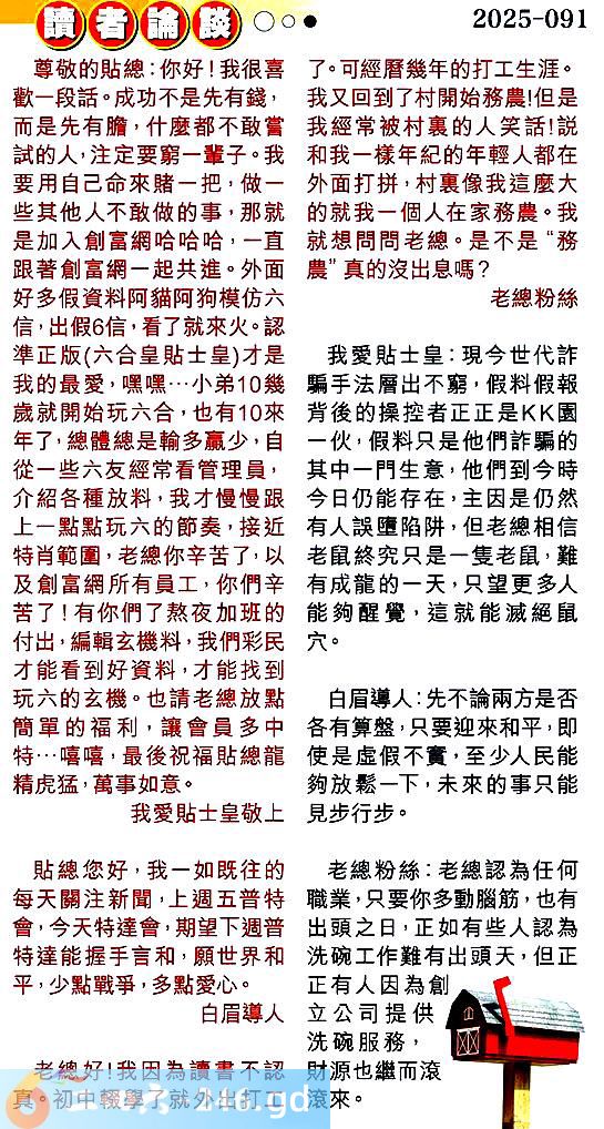 第零九一期讀者論談 1.尊敬的貼總:你好!我很喜歡一段話。成功不是先有錢,而是先有脆,什麼都不敢當試的人,注定要窮一辈子。我要用自己命來賭一把,做一些其他人不敢做的事,那就是加入創富網哈哈哈,一直跟著創富網一起共進。外面好多假資料阿貓阿狗模仿六信,出假6信看了就來火。認準正版(六合皇貼士皇)才是我的最愛,嘿嘿,小弟10幾歲就開始玩六合,也有10來年了,總體總是輸多贏少,自從一些六友經常看管理員,介紹各種放料,我才慢慢跟上一點點玩六的節奏,接近特肖範圍,老總你辛苦了,以及創富網所有員工,你們辛苦了!有你們了熬夜加班的付出,編輯玄機料,我們彩民才能看到好資料,才能找到玩六的玄機。也請老總放點簡單的福利,讓會員多中特...嘻嘻,最後祝福貼總龍精虎猛,萬事如意。我愛貼士皇敬上 〖我愛貼士皇〗:現今世代詐騙手法層出不窮,假料假報背後的操控者正正是園一伙,假料只是他們詐騙的其中一門生意,他們到今時今日仍能存在,主因是仍然有人誤墮陷阱,但老總相信老鼠終究只是一货老鼠,難有成龍的一天,只望更多人能夠醒覺,這就能滅絕鼠穴。 2.貼總您好,我一如既往的每天關注新聞,上週五普特會,今天特達會,期望下週普特達能握手言和,願世界和平,少點戰爭,多點愛心。白眉導人 〖白眉導人〗:先不論兩方是否各有算盤,只要迎來和平,即使是虛假不實,至少人民能夠放鬆一下,未來的事只能見步行步。 3.老總好!我因為讀書不認真。初中輟學了就外出打工了。可經曆幾年的打工生涯。我又回到了村開始務農!但是我經常被村裏的人笑話!說和我一樣年紀的年輕人都在外面打拼,村裏像我這麼大的就我一個人在家務農。我就想問問老總。是不是“務農"真的沒出息嗎?老總粉絲 〖老總粉絲〗:老總認為任何職業,只要你多動腦筋,也有出頭之日,正如有些人認為洗碗工作難有出頭天,但正正有人因為創立公司提供洗碗服務,財源也繼而滾滾來。