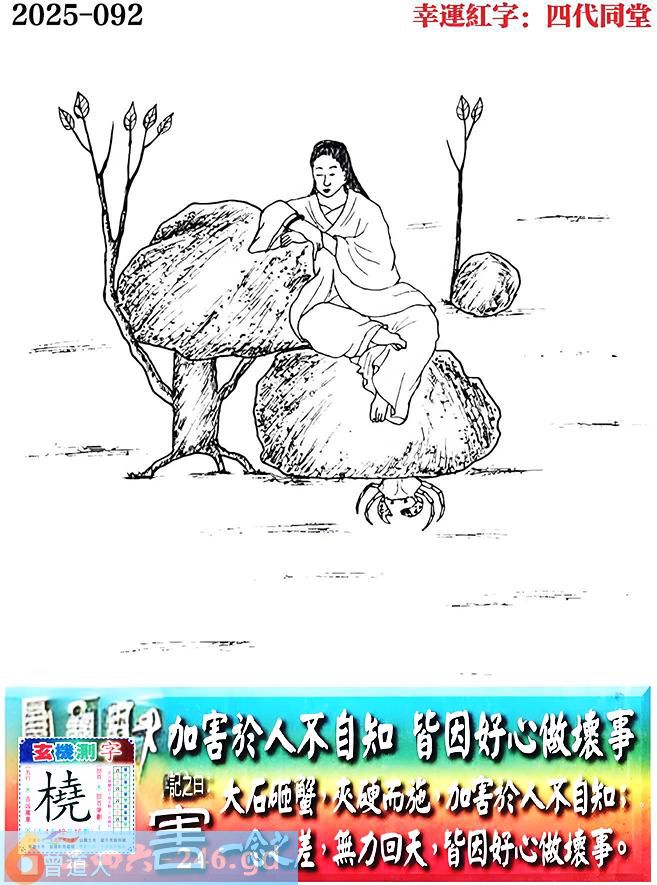 092期老版跑狗一字記之曰:【害】 詩雲:加害於人不自知,皆因好心做壞事。 大石砸蟹,夾硬而施,加害於人不自知; 一念之差,無力回天,皆因好心做壞事。 玄機測字:《橈》