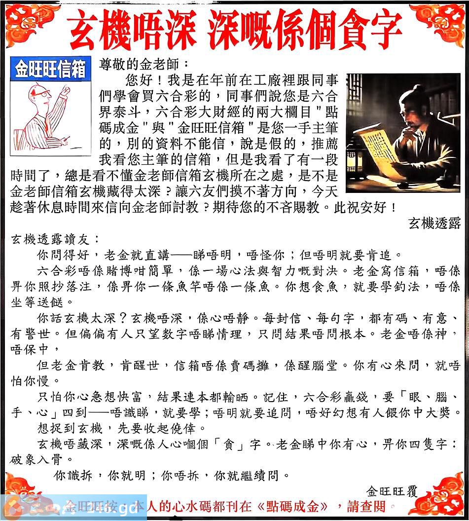 092期:金旺旺信箱彩民推荐→→《玄機唔深 深嘅係個貪字》