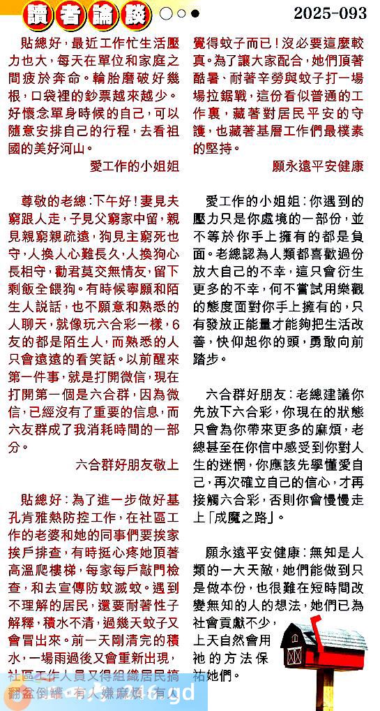 第零九三期讀者論談 1.貼總好,最近工作忙生活壓力也大,每天在單位和家庭之間疲於奔命。輪胎磨破好幾根,口袋裡的鈔票越來越少。好懷念單身時候的自己,可以随意安排自己的行程,去看祖國的美好河山。愛工作的小姐姐 〖愛工作的小姐姐〗:你遇到的壓力只是你處境的一部份,並不等於你手上擁有的都是負面。老總認為人類都喜歡過份放大自己的不幸,這只會衍生更多的不幸,何不嘗試用樂觀的態度面對你手上擁有的,只有發放正能量才能夠把生活改善,快仰起你的頭,勇敢向前踏步。 2.尊敬的老總:下午好!妻見夫窮跟人走,子見父窮家中留,親見親窮親疏遠,狗見主窮死也守人换人心難長久,人换狗心長相守,勤君莫交無情友,留下剩飯全狗。有時候寧願和陌生人說話,也不願意和熟悉的人聊天,就像玩六合彩一樣,6友的都是陌生人而熟悉的人只會遠遠的看笑話。以前醒來第一件事,就是打開微信,現在打開第一個是六合群,因為微信,已經沒有了重要的信息,而六友群成了我消耗時間的一部分。合群好朋友敬上 〖六合群好朋友〗:老總建議你先放下六合彩,你現在的狀態只會為你帶來更多的麻煩,老總甚至在你信中感受到你對人生的迷惘,你應該先學懂愛自己,再次確立自己的信心,才再接觸六合彩,否則你會慢慢走上「成魔之路」。 3.貼總好:為了進一步做好基孔肯雅熟防控工作,在社區工作的老婆和她的同事們要挨家挨戶排查,有時挺心疼她頂著高溫爬樓梯,每家每戶敲門檢查,和去宣傳防蚊滅蚊。遇到不理解的居民,還要耐著性子解釋,積水不清,過幾天蚊子又會冒出來。前一天剛清完的積水,一場雨過後又會重新出現,社區工作人員又得組織居民搞翻盆倒罐,有人嫌麻煩,有人覺得蚊子而已!沒必要這麼較真。為了讓大家配合,她們頂著酷暑、耐著辛勞與蚊子打一場場拉鋸戰,這份看似普通的工作裏,藏著對居民平安的守護,也藏著基層工作們最樸素的堅持。顾永遠平安健康 〖願永遠平安健康〗:無知是人類的一大天敵,她們能做到只是做本份,也很難在短時間改變無知的人的想法,她們已為社會貢獻不少,上天自然會用他的方法保祐她們。