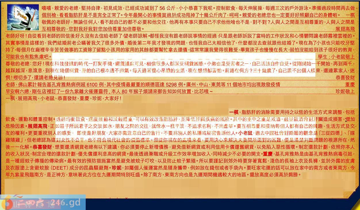 第093期《六合皇信箱文字版》10000%正確!!!正版二四六論壇*精心製作!!! 一棋、展翅高飛、小老鼠、恭喜發財、重慶、珍妮,大家好! 【1】.嘻嘻,親愛的老總,堅持自律,初見成效,已經成功減到了56公斤,小小恭喜下我呢。控制飲食,每天伸展操,每遇三次的戶外游泳。準備過段時間再去做個別檢,看看脂肪肝是不是完全正常了。今年最開心的事情莫過於成功甩掉了十幾公斤肉了,呵呵。親爱的老總您也一定要好好照顧自己的身體喲。一棋 〖一棋〗:脂肪肝的消除需要用持之以恒的生活方式來調整,包括飲食、運動和體重控制。透過均衡飲食、適度運動和減輕體重,可以有效改善脂肪肝,並降低肝臟疾病的風險。其中的重中之重是戒酒,過量飲酒會對肝臟造成損害,增加危險因素。 【2】.敬佩的老師好,無論任何人,看不起自己的都不必要和他交往,他再有本事只要自己不求他他啥也不是,對不對?人與人之間是互相尊重的,人與人之間是互相尊敬的,您對我好我對您加倍尊重加倍尊敬。展翅高飛 〖展翅高飛〗:正如莊子所說君子之交淡如水,朋友之間的交往,就像水一樣平淡,不追求名利,不尚虚華。要互相尊重和接納每個人都有自己的興趣、生活方式及交友的權利。更要重視別人的感受,即使是好朋友,大家亦需注意自己的言行,不要將別人的私限或秘密告訴他人。 【3】.老師好呀!自從看到老師的回信後好久沒有去信給老師了望老師諒解。嘟怪我沒有跟老師說事情的經過,只是跟老師訴說了當時的工作狀況和心情鬱悶讓老師霧裡雲裡的。其實事情是這樣的,我們結婚前老公瞞著我欠了很多外債,婚後第二年我才發現的問題,也怪我自己太相信他了,什麼都沒去查就跟他結婚了。現在為了小孩也只能咬牙堅持了每個月在廠裡辛辛苦苦做事的工資除了留點小孩用的家用的其餘都要幫忙拿去還債,這常常讓我覺得很難受,畢竟孩子也慢慢在長大,就怕沒能給到孩子很好的教育,可能我也有點焦慮吧。學生:小老鼠敬上 〖小老鼠〗:過去中國社會對婚姻的觀念是「三從四德」、「嫁雞隨雞」,但老總認為這對女性不公平,也不符合現代社會的價值標準。但從你現在的處境來看,要用決心來解決夫妻間所面對的困難便是清楚判斷問題的根源所在,然後一一化解。 【4】.尊敬的老總:您好!現在科技發達的時代一打開手機,網貸隨處可見,相信很多人都深受網貸困惑。小弟也是受害者之一,自己活該自作自受。從剛開始一千開始,再到兩千,越踩越深,息滚息,到現在幾個網貸壓的自己根本透不過氣。每天過著提心吊膽的生活,現在想想都害怕。前路在何方?三十幾歲了,自己混不出個人樣來,還連累家人,迷惘!嘮叨多了,還請老總見諒!恭喜發財 〖恭喜發財〗:想要還清網貸老總有以下建議,你必須要停止新增債務,避免借新網貸或利用信用卡償還舊網貸,以免陷入惡性循環。制定還款計劃,依照你本人的收入狀況制定合理的還款計劃,優先償還利息高的網貸。最後透過兼職或升級工作效率增加收入,同時減少不必要的開支。 【5】.老師,佛山累計報告基孔肯雅熱病例超6100例,其中疫情最嚴重的順德區達5298例。廣州、中山、東莞等11個地市均出現散發疫情重慶 〖重慶〗:基孔肯雅熱是由基孔肯雅熱病毒引起,是一種經蚊子傳播的傳染病。最有效的預防措施當然是避免被蚊子叮咬,以及防止蚊子繁殖。所以要謹記到郊外時要穿著寬鬆、淺色的長袖上衣及長褲,並於外露的皮膚及衣服塗上含避蚊胺()成分的昆蟲驅避劑。 【6】.早安啊六總,剛在店裡訂了一份九紫離火催運靈符,本人80年猴子煩請來郵告知如何放置,比芯哦珍妮敬上 〖珍妮〗:如屬個人催運當然是隨身攜帶,例如放在錢包或者手袋內。要旺家宅運的話可以放在家中的南方或者東南方,今年九紫星飛臨南方,是正神方,意味著此方位在九運期間特別旺盛。除了南方,東南方向也是九運期間機遇較大的地區。擺放高度必須高於肩膀。 紅字:山林隱逸 暗码:02101228 [释义]指隐居山林的士人,即隐士。 [出处]听他说话,像几个山林隐逸。