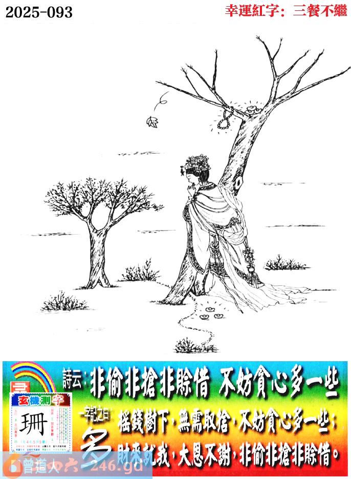 093期老版跑狗一字記之曰:【多】 詩雲:非偷非搶非賒借,不妨貪心多一些。 搖錢樹下,無需取捨,不妨貪心多一些; 財來就我,大恩不謝,非偷非搶非賒借。 玄機測字:《珊》