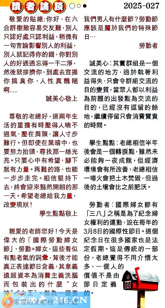 第零二七期讀者論談 1.敬愛的貼總:你好,在六合群樹敵容易交友難,別人只認好處只認利益,稍微有一句言論影響別人的利益,別人就記得你的錯,你對別人的好通通忘得一干二淨,然後就排擠你,到處去宣揚你搞臭你,人性真醜陋啊......誠美心敬上 〖誠美心〗:其實群組是一個交流的地方,過於執著利益得失,只會令群組交流的,目的變質,當眾人都以利益為前題的出發點為交流的目的,已經沒有逗留的餘地,繼續停留只會消費寶貴的時間。 2.尊敬的老總好,這兩年生活的重擔有時壓得人喘不過氣,壓在肩頭,讓人寸步難行。但即使在黑暗中,也要努力抬頭,尋找那一絲光亮。只要心中有希望,腳下就有力量。再難的路,也能一步步走完。相信堅持下去,終會迎來豁然開朗的那一天。希望老總給我力量,改變現狀!學生點點敬上 〖學生點點〗:老總相信半年後會是一個轉淚點,雖然未必能夠一夜成龍,但經濟環境會有所改善,老總相信一場火會把土木焚毁,但過後的土壤會比之前肥沃。 3.親愛的老師您好!今天是偉大的「國際勞動婦女節」,勞動婦女,這些看似有點老氣的詞彙,背後才能真正表達節日含義,其意義遠超資本為消費主義洗腦而包装出的什麼“女神”“女王”。做為一個男人,家裡的頂樑柱,想不通我們男人有什麼節?勞動節應該是屬於我們的特殊節...勞動者 〖勞動者〗:國際婦女節有「三八」之稱是為了紀念婦女權利的運動,設在每年的3月8日的國際性節日。這個紀念日在很多國家也是法定假期。這是傳統的一部份,老總覺得不用介懷太多,一個人的價值不是由節日定義的。