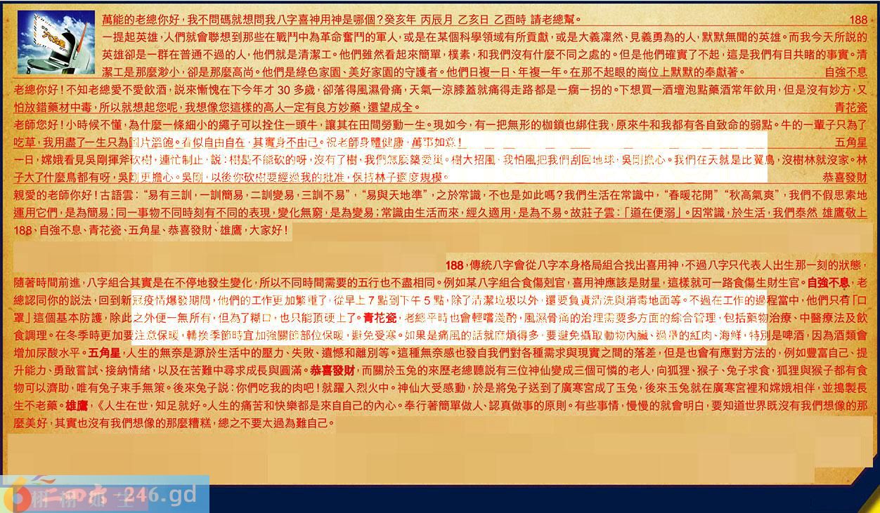 〖188〗:傳統八字會從八字本身格局組合找出喜用神,不過八字只代表人出生那一刻的狀態,隨著時間前進,八字組合其實是在不停地發生變化,所以不同時間需要的五行也不盡相同。例如某八字組合食傷剋官,喜用神應該是財星,這樣就可一路食傷生財生官。