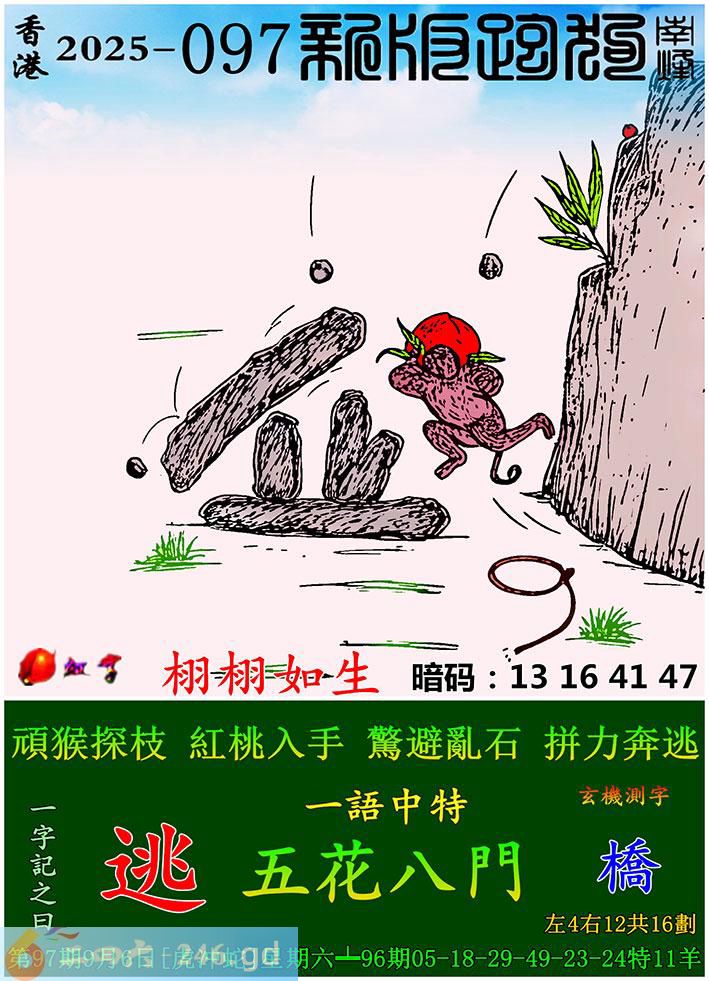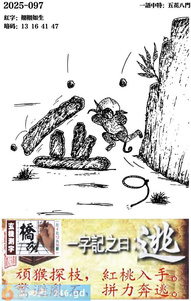 097期跑狗一字記之曰:【逃】 頑猴探枝,紅桃入手。 驚避亂石,拼力奔逃。 玄機測字:《橋》 一語中特:五花八門