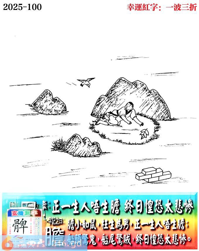 100期老版跑狗一字記之曰:【膽】 詩雲:正一生人唔生膽,終日惶恐太悲慘。 膽小如鼠,枉生為男,正一生人唔生膽; 船頭驚鬼,船尾驚賊,終日惶恐太悲慘。 玄機測字:《髀》