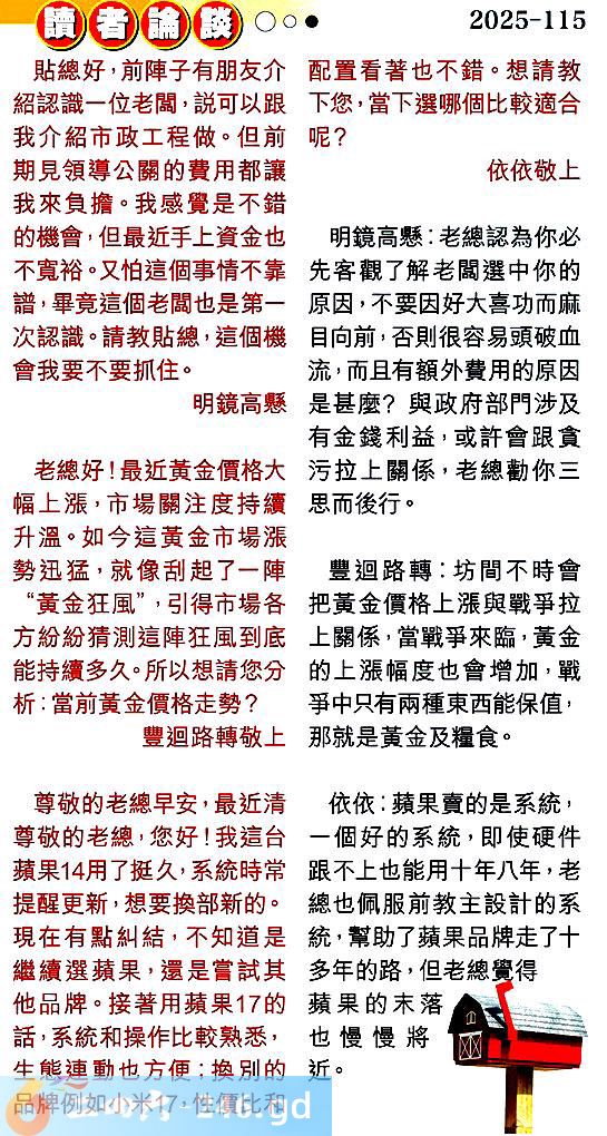 第一一五期讀者論談 1.貼總好,前陣子有朋友介紹認識一位老闆,說可以跟我介紹市政工程做。但前期見領導公關的费用都讓我來負擔。我感覺是不錯的機會,但最近手上資金也不寬裕。又怕這個事情不靠譜,畢竟這個老闆也是第一次認識。請教貼總,這個機會我要不要抓住。明鏡高懸 〖明鏡高懸〗:老總認為你必先客觀了解老闆選中你的原因,不要因好大喜功而麻目向前,否則很容易頭破血流,而且有額外費用的原因是甚麼?與政府部門涉及有金錢利益,或許會跟貪污拉上關係,老總勸你三思而後行。 2.老總好!最近黃金價格大幅上漲,市場關注度持續升溫。如今這黃金市場漲勢迅猛,就像刮起了一陣“黃金狂風”,引得市場各方紛紛猜測這陣狂風到底能持續多久。所以想請您分析:當前黃金價格走勢?豐迴路轉敬上 〖豐迴路轉〗:坊間不時會把黃金價格上漲與戰爭拉上關係,當戰爭來臨,黃金的上漲幅度也會增加,戰爭中只有兩種東西能保值,那就是黃金及糧食。 3.尊敬的老總早安,最近清尊敬的老總,您好!我這台蘋果14用了挺久,系統時常提醒更新,想要換部新的。現在有點糾結,不知道是繼續選蘋果,還是嘗試其他品牌。接薯用蘋果17的話,系統和操作比較熟悉,生態連動也方便;換別的品牌例如小米17,性價比和配置看著也不錯。想請教下您,當下選哪個比較適合呢?依依敬上 〖依依〗:蘋果賣的是系統,一個好的系統,即使硬件跟不上也能用十年八年,老總也佩服前教主設計的系統,幫助了蘋果品牌走了十多年的路,但老總覺得蘋果的末落也慢慢將近。