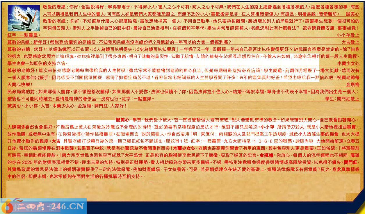 第019期《六合皇信箱文字版》10000%正確!!!正版二四六論壇*精心製作!!! 誠美心、小小存、大吉、木蘭少女心、金瓶梅、開門紅,大家好! 【1】.敬愛的老總:你好,俗話說得好:寧得罪君子,不得罪小人。害人之心不可有,防人之心不可無。我們在人生的路上總會遇到各種各樣的人,經歷各種各樣的事,有些人可以稱得是我們人生中的贵人,可有些人卻是我們大家都唯恐避之,而無不及的小人。喜歡搬弄是非,在人背後暗箭傷人。有道是:明槍易躲,暗箭難防。誠美心 〖誠美心〗:畢竟,我們從小到大,就一直被灌輸做人要有禮貌、對人要體貼這樣的觀念。如果能讓別人開心,自己就會跟著開心,人際關係自然也會很好。不過當遇上被人在背後放冷戰或不合理的對待時,就必须要有某種程度的反抗才行,絕對不能只是啞忍。 【2】.敬爱的老總:你好,不知道為什麼人心那麼險惡,當他想除掉某一個人,不用自己動手,他只要挑拔離間,製造增加別人的矛盾就行了。這讓學生想到一個很可怕的字詞借刀殺人,借別人之手除掉自己的眼中釘,最後自己漁翁得利。在這個和平年代,學生非常反感這類人,老總您對此有什麼看法?祝老總身體安康,事事如意!紅字:一點靈犀。小小存敬上 〖小小存〗:所謂借刀殺人,就是小人暗地裡扭曲事實,故作隱瞞,或者無中生有,在你背後搞小動作挑撥離間。在職場而言,對於這種人,你自然要用「明」來應付:向相關的人及部門提高工作透明度,減低小人造謠生事的機會,也大大提升他攪小動作的難度。 【3】.尊敬的呂總:新年好!都說登信講究的是緣份,不知我和呂總有沒有緣份呢?呂總新的一年可以給大家一個福利嗎?大吉敬上 〖大吉〗:其實老總打從轉肖後的第一期已經把紅包不斷送出開蛇肖1號,紅字:一點靈犀、九方大師特尾:、13、6、8尾的號碼。諭碼內容:大地開始解凍。立春五日後,蜇居的蟲類慢慢在洞中姓醒。若果買不中蛇,就是有心魔認為不會開重肖而矣! 【4】.尊敬的老總,您好!"以銅為鏡可以正衣冠,以人為鏡可以明得失,以史為鏡可以知興衰」一年過了又一年,回顧這一年來自己是否比以往變得更好?於我而言答案是肯定的。除了自身的努力,也要感謝您與六信這版塊。從您這裡學到了很多東西,明白了儲蓄的重要性,知道了親情,友誼的維持在於相互理解與包容。不管未來如何,感謝有您相伴的這一段人生路程,學生也會一如既往的支持六信。木蘭少女心 〖木蘭少女心〗:老總也很高興你學會了有用的東西,其中包容别人更是重要。正如俗諺:「將軍額前可跑馬,宰相肚裡能撐船。」唐太宗李世民也因包容而成就了太平盛世,正是包容的胸襟使李世民留下了魏徵,吸取了逆耳的忠言。 【5】.尊敬的老總好!這次來信是感謝老總每期帶給我的人生哲學!雖然常常不能體會到老總的用心良苦,但是每期還是堅持必看信箱學生屬雞,前兩個月經歷了一場大災難,然而沒有一個人願意伸出援手!因為感受不到關懷跟關愛,還得了抑鬱症痛苦不堪!看著信箱老總講解的人生哲學看開了許多!去年的運氣真的好差!希望老總給我一點信心吧!祝願老總每天開心快樂!金瓶梅 〖金瓶梅〗:你放心,每個人的流年運程也不相同,屬雞的你在2025年的財運表現相當不錯,迎來吉星的加持,特別是正財運勢,貴人相助將為你帶來更多機遇。不過,需特別注意避免過度參與賭博或高風險投資,以免得不償失。 【6】.民政局說的對:如果那個人寵你,領不領證都沒關係,如果那個人不愛你,法律也保護不了你,因為法律拴不住人心。結婚不等於幸福,單身也不代表不幸福。因為我們出生是一個人;最後也不可能同時離去。愛情是精神的奢侈品一沒有也行。紅字:一點霾犀。學生:開門紅敬上 〖開門紅〗:其實民政局的意思是法律上的婚姻確實提供了一定的法律保障,例如財產繼承、子女扶養等。可是,若是婚姻建立在缺乏愛的基礎上,這種法律保障又有何意義?反之,身處真摯情感中的伴侶,即便未婚,也常常能夠在面對生活的各種挑戰時互相支持。 紅字:杯酒解怨 暗码:05142940 [释义]指饮酒言欢,消解仇怨。 [出处]《新唐书·张延赏传》:“吾武夫虽有旧恶,杯酒间可解。”
