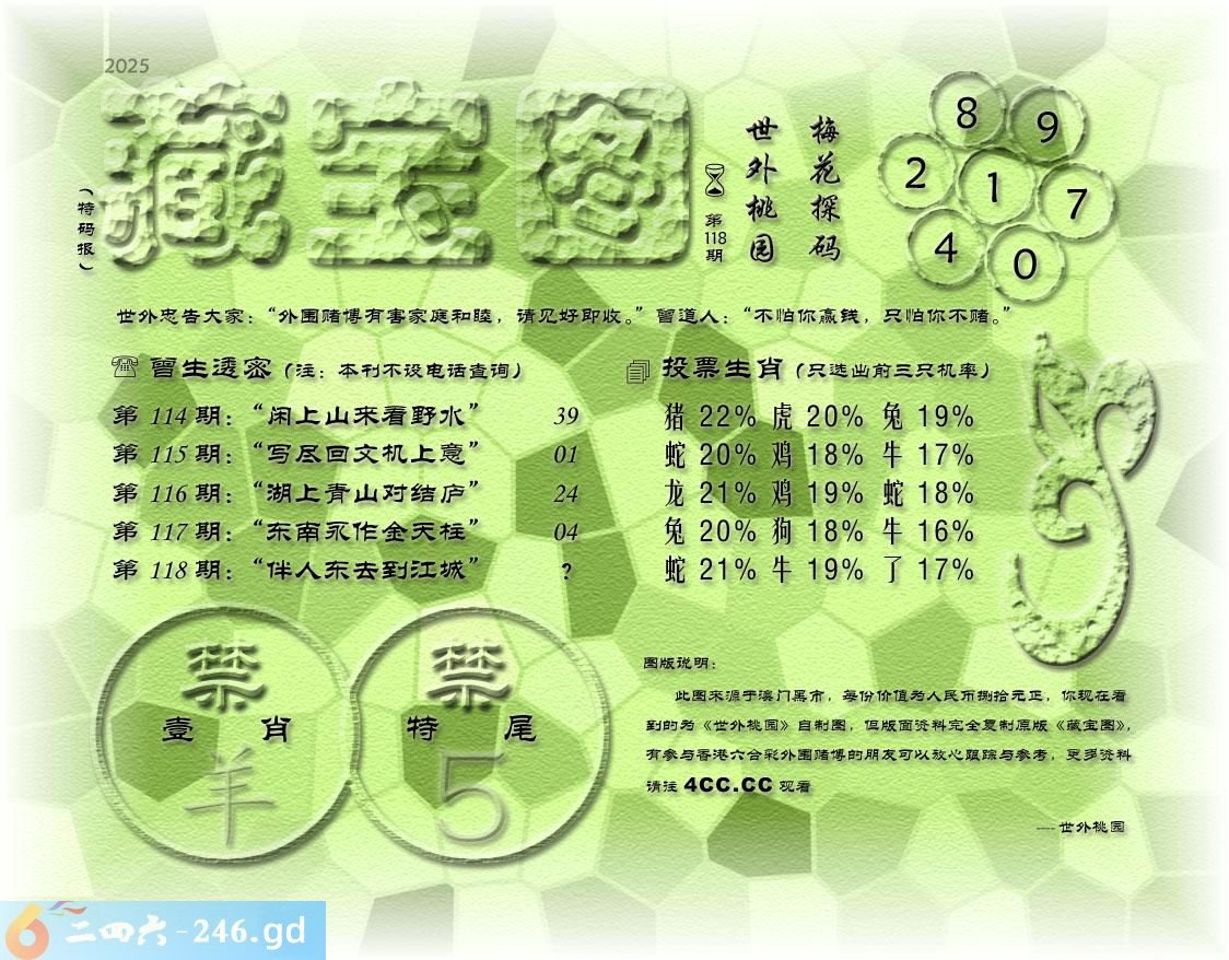 118期藏寶圖 新:苏小门前万缕垂 老:伴人东去到江城 禁:羊 禁:5尾 玄機字:《存》