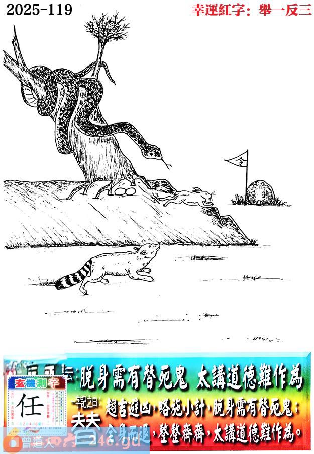 119期老版跑狗一字記之曰:【替】 詩雲:脱身需有替死鬼,太講道德難作為。 趨吉避凶,略施小計,脱身需有替死鬼; 全身而退,整整齊齊,太講道德難作為。 玄機測字:《任》