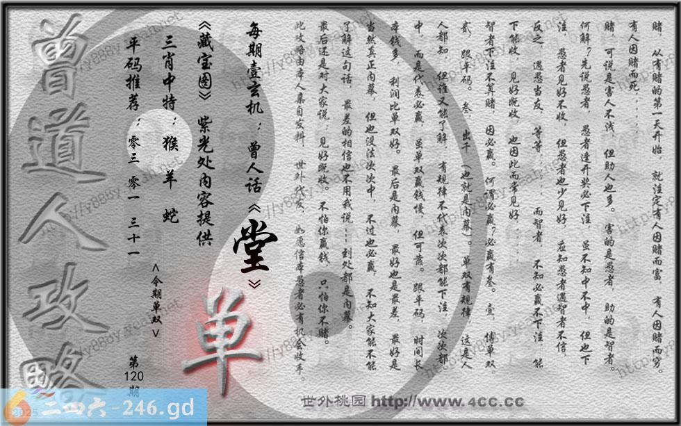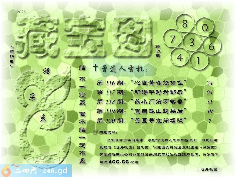 120期藏寶圖 新:荒园茅塞闭墙隈 老:自古骄兵多致败 禁:狗禁:9尾玄機字:《堂》