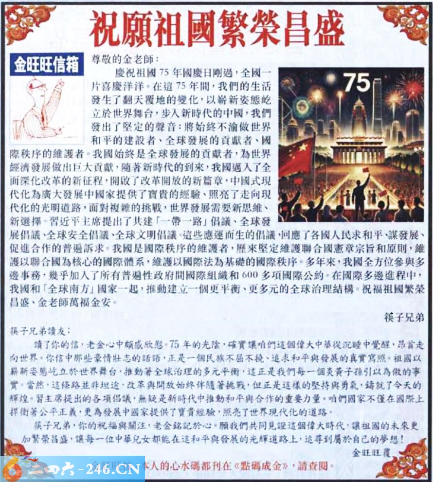 030期:金旺旺信箱彩民推荐→→《祝願祖國繁榮昌盛》