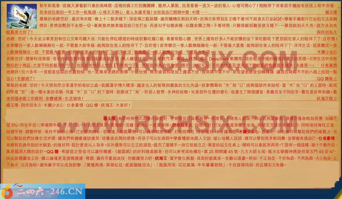 第031期《六合皇信箱文字版》10000%正確!!!正版二四六論壇*精心製作!!! 楊玉環、與你到永久、木蘭少女心、仕者豪情、糖、妖海王,大家好! 【1】.新年新氣象,這幾天算餐飲行業的高峰期,店裡的員工忙的團團轉,雖然人累點,但是看著一波又一波的客人,心裡可開心了!刚刚停下來拿起手機給老叔送上新年祝福,祝老叔在新的一年工作一帆風顺,心情天天開心,家人永遠幸福!也祝我自己期期中獎,中獎......楊玉環 〖楊玉環〗:春節時期中式酒樓市道較好,生意额及訂座率都有一成增長,不過客人點菜不如以前那麼豪爽,酒樓亦僅敢略為提價,加幅不超5%。而在年初二準備開年飯,不少而民一早去街市買菜。買海鮮、活雞、豬肉都一度要排隊。 【2】.尊敬的老總您好:最近有失眠,晚上十二點多睡下,深夜兩三點就醒,繼而輾轉反側到天明。近兩日來想到反正睡不著何不起身去打坐試試。學著手機影片打坐的方法含胸閉目,思想放鬆到不去想一切。漸漸竟然無意識到自己在打坐,而是似乎似睡非睡,似醒非醒之間。不看時間,只覺得腿部難受便又睡下,一覺就能到天大亮。這方法治失眠真是太好了!與你到永久 〖與你到永久〗:你做得對!打坐一般是身體平坐後,將腿交叉持於身體前方,同時保持脊柱正直,抬頭平視、調整呼吸、保持平静的心態,打坐能夠靜心,容易進入睡眠顆態,可以緩解輕度失眠,打坐時間在10分鐘到15分鐘為宜。 【3】.老總:您好!今天坐公車見到有位公交車司機大叔,只能在停紅綠燈的時候抓緊吃幾口飯,看著有點心酸,世界上還有好多人不能安穩的坐下來吃飯呢?更別說在家人的陪伴下了,且珍惜!非常嚮往一家人歡樂融融在一起,不管最大的幸福,能夠說在家人的陪伴下了,且珍惜!非常嚮往一家人歡樂融融在一起,不管最大富贵,能夠說在家人的陪伴下了,洋洋生活,就是嚮往一家人歡樂融融在一起,不管最大富貴,能夠的在家人的降伴下了,洋洋生活,就是嚮往一家人歌樂的生活,不管最大幸福。木蘭少女心 〖木蘭少女心〗:跟家人一起吃飯可以幫助我們舒緩壓力,也可以幫助我們放慢生活步調,讓我們有機邊談邊笑,培養彼此間的感情。而孩子可以在過程中學會禮貌地跟人交談,留心地聽人說話,還可以學到很多新詞彙,並學會表達自己。 【4】.老總您好,随著科技發展,各式各模的黑科技產品转领走進生活,無人機送快遞,無人駕駛汽車,機器人跳舞,還有軟體等,這些都是中國的驕傲與實力的見證。日常生活中也有類似的小商品,大家平時装飯用的勺子,也没計的特別人性化【不懂翁勺子】,使用起来的很方便,随手一放就可以。不知老總是否使用嗎?祝創富網會員越來越多,永遗第一。仕者豪情 〖仕者豪情〗:老總有見過你說的米飯匙,的確好用,設計更是以人為本。另外還有可以立正的渴匙,盛完了湯随手一放它就能立正,筆直的站立在桌上,隨時可以拿起來再用。夏面有一個接碟,湯汁不會外流,真是腦洞大開的設計。 【5】.老總好!玩六多年,一直都是信箱的忠實粉絲,也一直秉承老總的教導,小賭怡情,無奈資質有限加上運氣不佳,經常猜中買不中,來信望老總登信轉轉運,讓我在崎嶇不平的六路上找到一點信心!先謝過了!糖敬上 〖糖〗:希望這次登信可以讓你轉还,《創富網》的好料随處都是,你可以参考其他欄目。第25期開雞45號,九方大師5尾、風水玄學顯神通提供第五門45至47、扶乩密碼屬金之肖、蕭公論壇更是捷報連連,標題:雞肖可重施故技,你继續努力吧。 【6】.尊敬的老總:您好!今天想和您分享漢字的奇妙之處。我國漢字博大精深,蘊含古人的智慧與豐富的文化內涵。就拿簡單的“木”和“口”這兩個部件來說吧,當“木”在“口”的上面時,組成的字是“杏,是一種水果的名稱,而當“木”在“口”的下面時,就變成了“呆",形容人發愣、失神的狀態。光是部件位置的變化,就產生了兩個讀音、意義完全不同的字,實在是非常有趣。最後祝福老總工作順利,身體健康,生活愉快!妖海王敬上 〖妖海王〗:漢字變化無窮,其奇妙處真是一言難以道盡。例如:不正為歪、不好為孬、不用為爾、大小為尖、上下為卡、日月為明。還有疊字可以成為對聯,「鶯鶯燕燕,翠翠紅紅。處處融融洽洽」、「風風雨雨,花花葉葉,年年暮暮朝朝」,不但寫得特別,而且精彩又有趣。 紅字:強嘴善道 暗码:01162642 [释义]指能说会道。自知理亏而口头上不肯认错或服输。