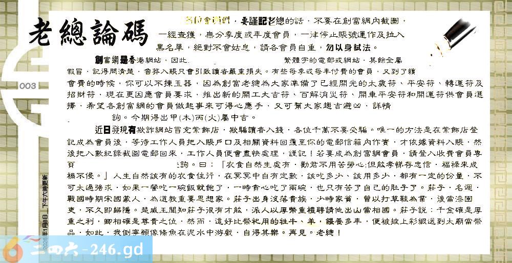 003期:六合皇金句/老总论码/萧公子/林大师/五行夺码/老总信箱截图