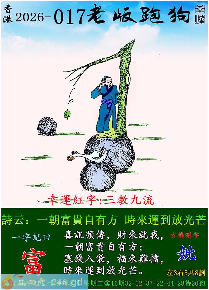 本帖最后由山丘于2026-2-1013:50编辑 017期老版跑狗一字记之曰:【富】 诗云:一朝富贵自有方,时来运到放光芒。喜讯频传,财来就我,一朝富贵自有方; 塞钱入袋,福来难挡,时来运到放光芒。 是什么喜讯还接连不断地传来呢?是什么方法一朝就富贵了?时来运到放光芒是不是说之前黯淡无光?更或者之前被隐藏? 欢迎各位大神讨论交流!